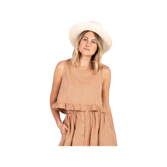 The Bronze Oceanside Top by Rylee and cry is the perfect top to wear on your family getaway this spring. This sleeveless cropped woven top is the perfect mix of stylish and playful, featuring a ruffle trim at the bottom and button back opening.
