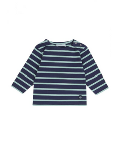 Baby's Breton striped shirt, boat neck, three press studs on the shoulder, blue with grey stripes, thick cotton.