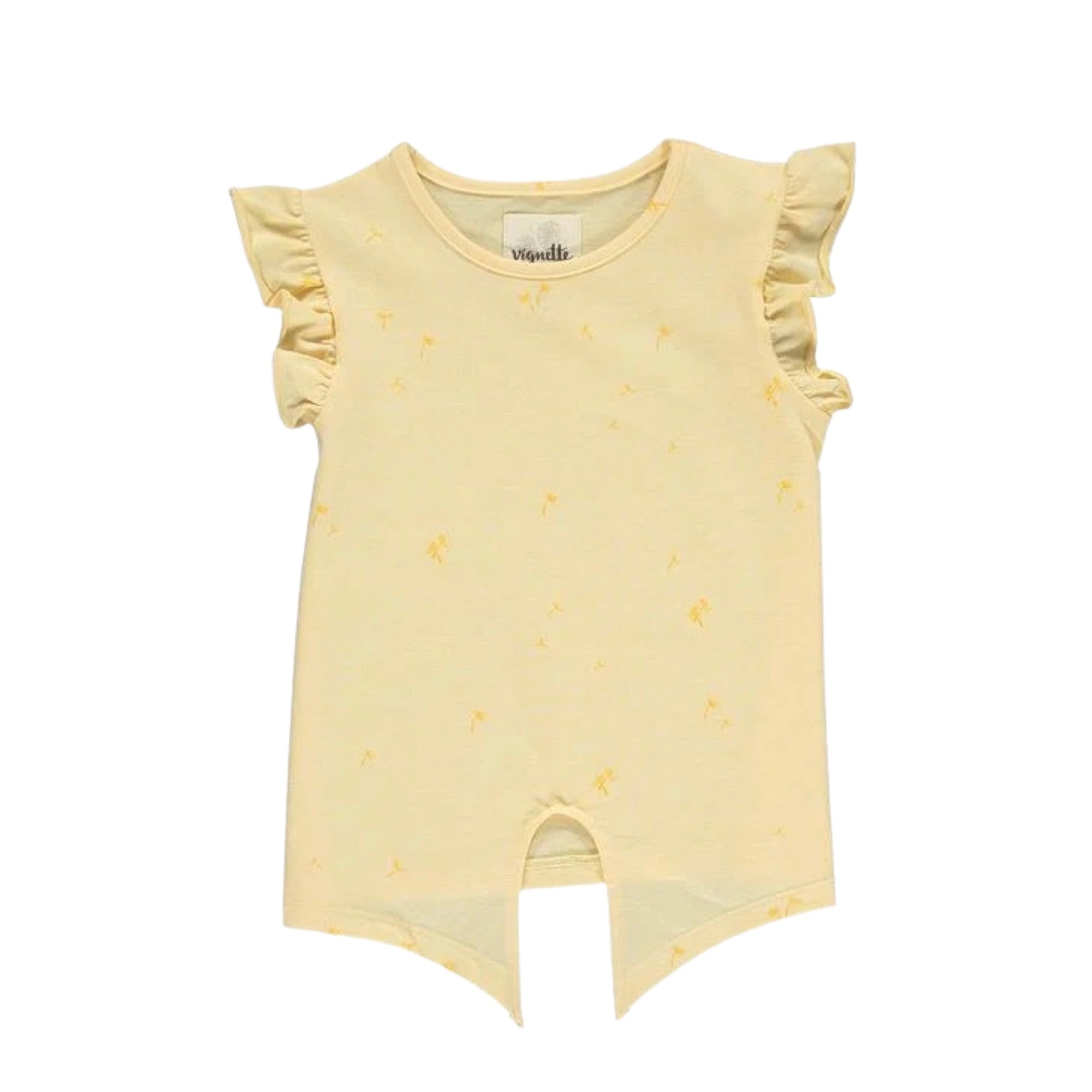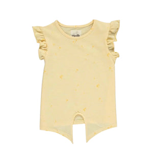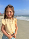 A flutter sleeve and a tie front detailing? Yes please! We just adore this new dandelion print cotton t-shirt. Pair her with one of our soft linen shorts and you have the perfect spring outfit!